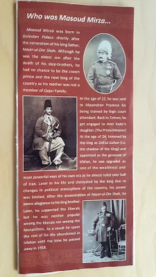 Mais revenons au Palais Masoudeh. Il a été construit en 1879, pour être le bureau du prince Masoud Mirza (1850 - 1918), le du fils ainé de Nasser-ul-din Shah (Nasseredin Shah 1848 - 1896, 4 ème shah de la dynastie Qajar. Le prince Masoud Mirza était le gouverneur d'Esfahan.