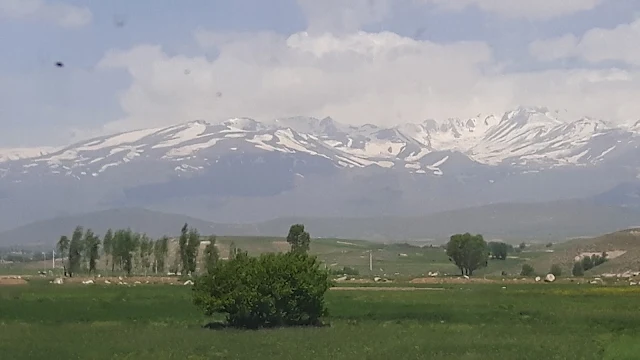On aperçoit les sommets enneigés. Je pense que ce sont les Sahand mountains dont les pics dépassent les 3000 m et dont le plus haut est le Mont Kamal qui culmine à 3707 m.